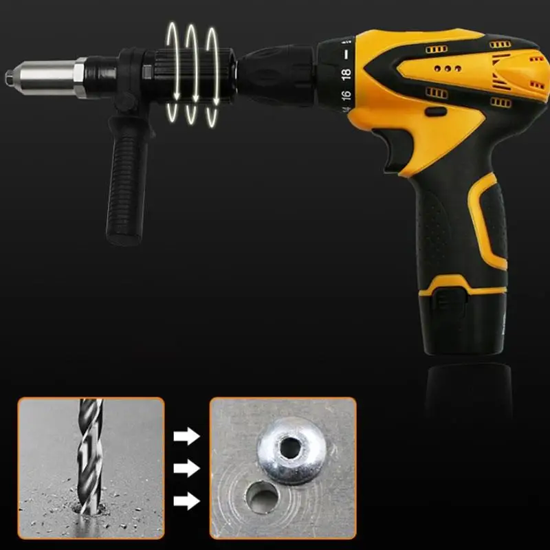 Адаптер с заклепками позволяет быстро превратить электросверлильный станок в пистолет с заклепками, что является практичным и удобным в использовании.