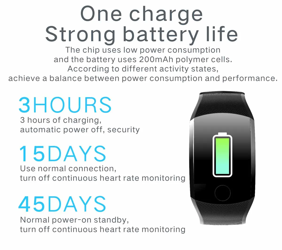 Чип использует низкое энергопотребление, а аккумулятор использует полимерные элементы емкостью 200 мАч. В соответствии с различными условиями деятельности, достичь баланса между энергопотреблением и производительностью.
