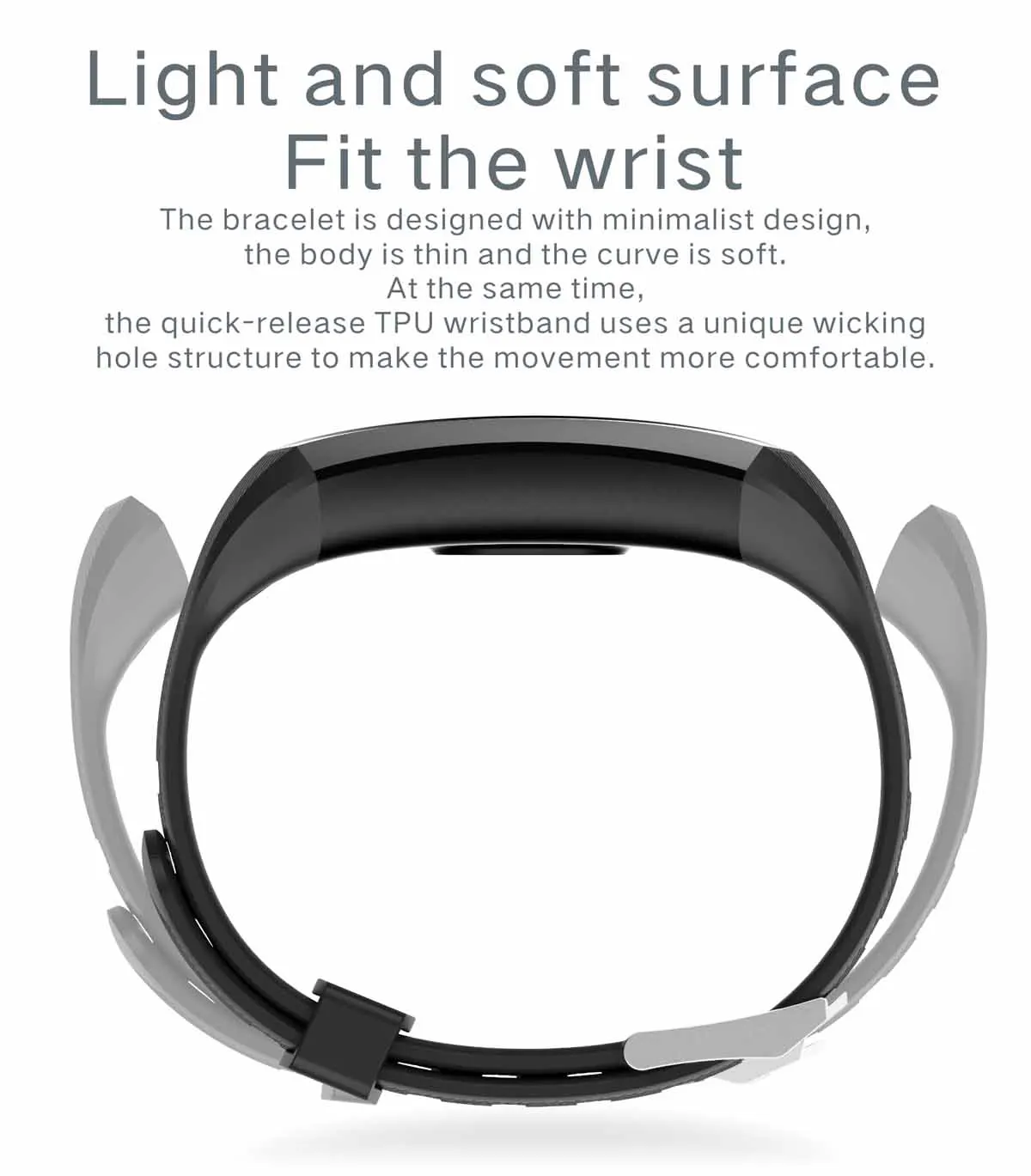 Браслет разработан с минималистским дизайном, тонкий корпус и мягкая изгиба. В то же время быстросъемный браслет из ТПУ использует уникальную влагоотводящую структуру отверстия, чтобы сделать движение более удобным.