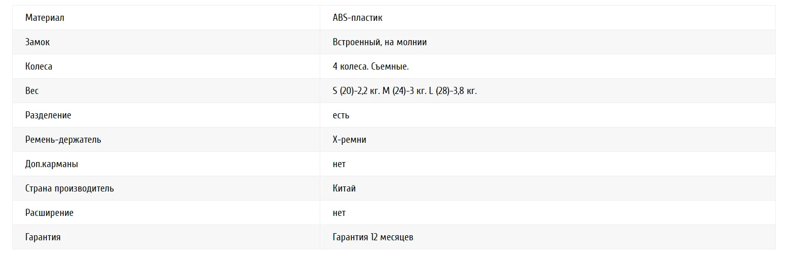 Изготовлен из высокопрочного пластика ABS. Четыре прочных колеса позволяют легко перемещать чемодан. Имеет телескопическую ручку с фиксатором, эластичная прорезиненная ручка и кодовый замок. Особенности модели: съемные колеса, отделение с эластичными ремнями, предохраняющими одежду от перемещения; отделение на молнии; карман на молнии. РАЗМЕРЫ - с учетом колес и всей внешней фурнитуры: 20" - 22*37*60 см. 24" - 27*43*69 см. 28" - 32*48*76 см.