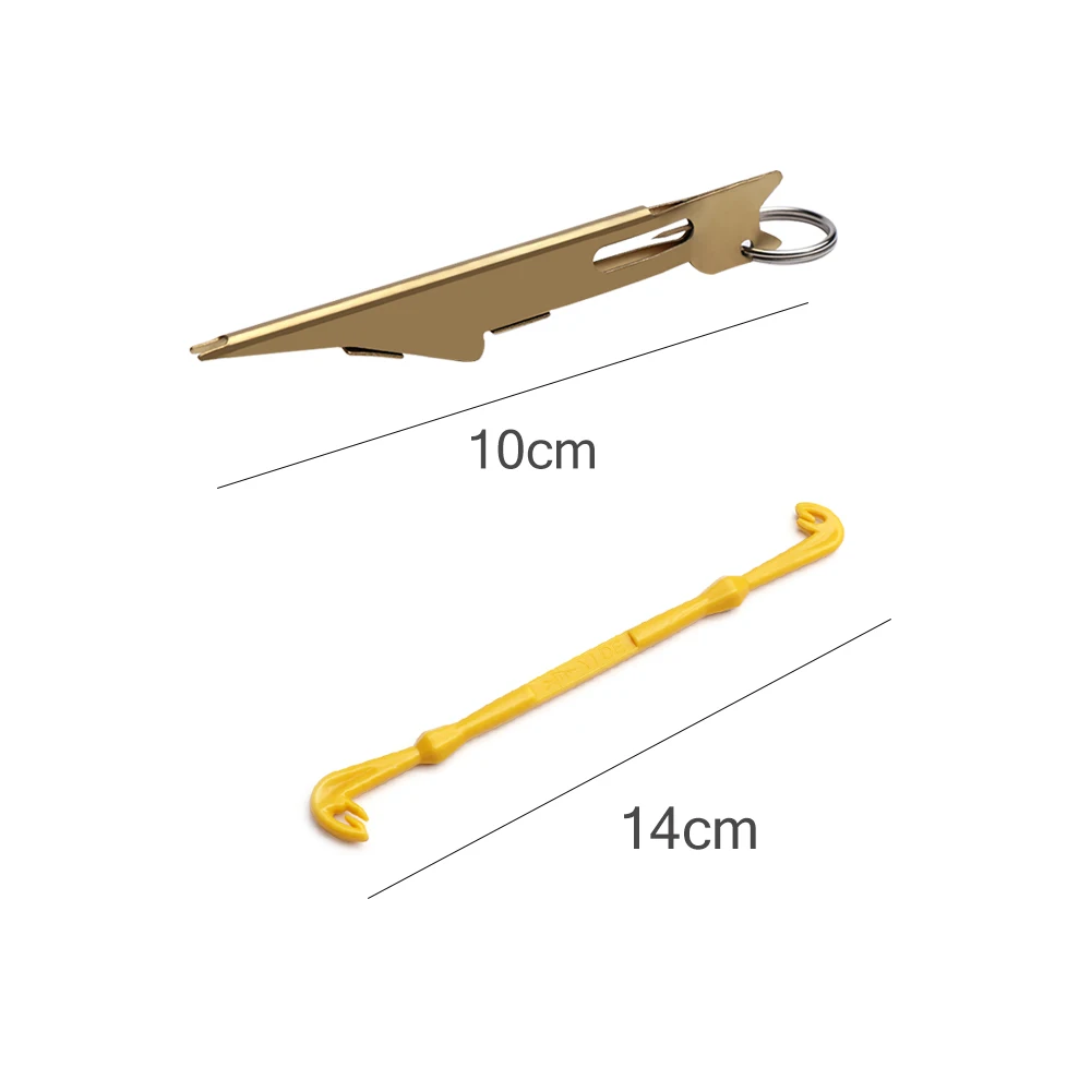 Quick Knotting Tool: for fast knotting of different safety knots Hook Remove Tool: Quickly remove the fish hook on the caught fish Fly fishermans must have gear Equipped with D-ring to attach to lanyard for easy access You wont want to fish without it Tie your entire fly line with this tool Clean your eye holes with the built in needle Description: 1. Loop Tyer & Hook Disgorger Tool Loop Tyer one end - Std Disgorger(hook remover) the other Loop tyer is used to consistently tie small loops that are ideal for hair rigs or hook lengths Fishing disgorger is perfect for removing hooks from fish with teeth or deeply-hooked fish Material: High Quantity Plastic Size: 140mm x 17mm, 5.5" x 0.6" (L x W) Net Weight: 3.5g / pc 2. Quick Nail Knot Tying Tool For tying a Nail Knot on a fly line Tie a number of different varieties of secure nail knots Hook eye cleaner attached Makes short work of tying the Nail Knot Material: Metal Color: Silver,Gold,Black Length: about 10 cm Attachment: with ring, easy to carry Package:1 x metal knot tying tool or(1 x plastic loop tyer tool) with paper step instructions in the package OPP packing