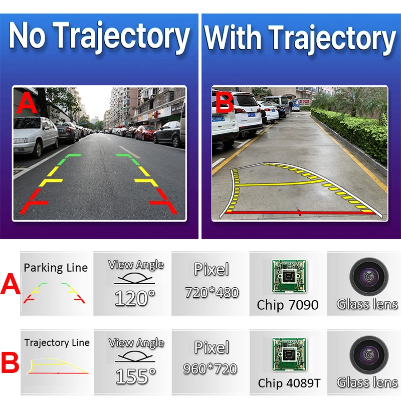 A: камера без динамической траектории. Не поддерживает траекторию парковки. B: Встроенный динамический траекторный чип камеры B. Поддержка траектории парковки.