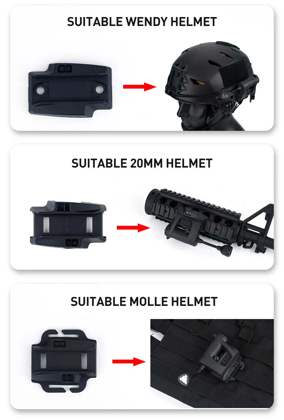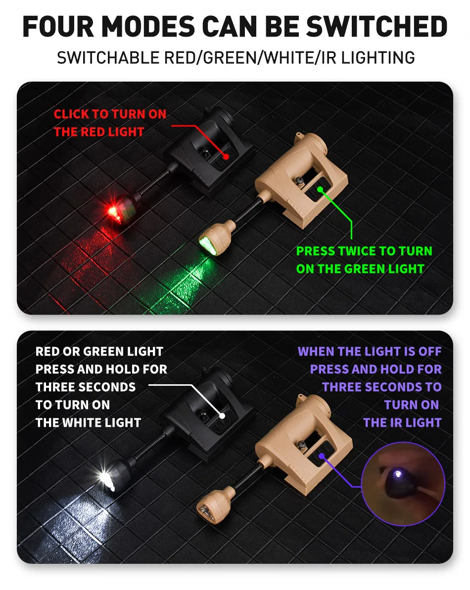 Mpls-Helmet Lights-инструмент для освещения можно прикрепить к шлему MICH или к любой системе molle vest. Он имеет 2 дюймовую гибкую шею, которая позволяет легко и точно освещать задачи только в чехол, слишком темно, чтобы увидеть, что вы читаете. Вы можете легко изменить батарею без использования каких-либо инструментов. 1. Используйте аккумулятор: cr123A * 1 или 16340*1 2. Время выдержки: белый светильник (cr123A) 10 часов, (16340) 3 часа, дорожный светильник s ≥ 100 часов 3. Белый светильник: 20 лм (cr123A) / 60 лм (16340) 4. Режим: Красный/зеленый/белый/ИК 5. Красный светильник: нажмите переключатель один раз, чтобы включить красный светильник, зеленый светильник: нажмите дважды, чтобы включить белый светильник: нажмите и удерживайте переключатель, чтобы включить белый светильник, когда красный или зеленый светильник включен 6. Оснащен 6 различными монтажными базами, Которые могут быть применены в различных сценариях. 7. Новая версия добавляет две опоры, которые могут быть установлены на шлеме одновременно с гарнитурой, увеличивая яркость освещения