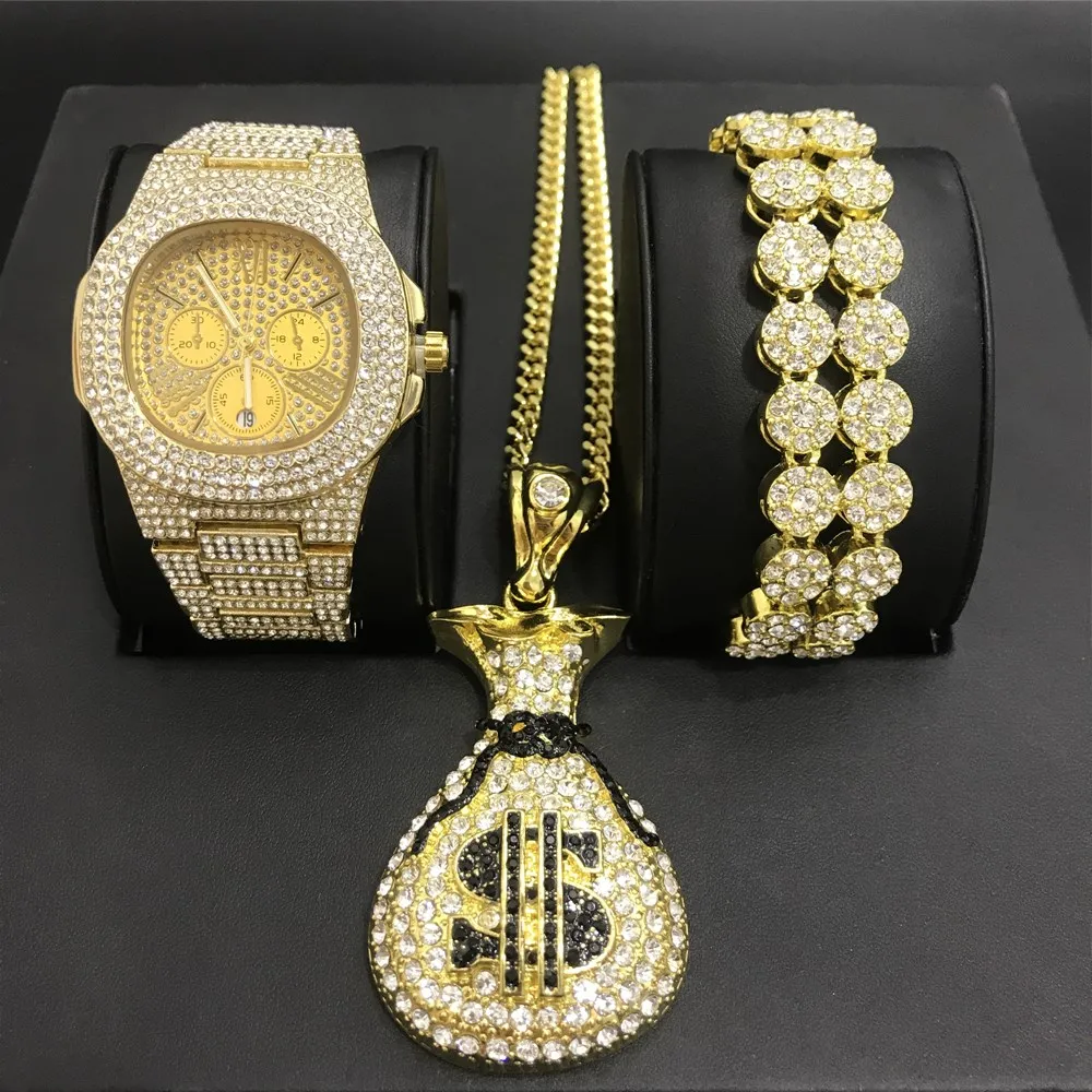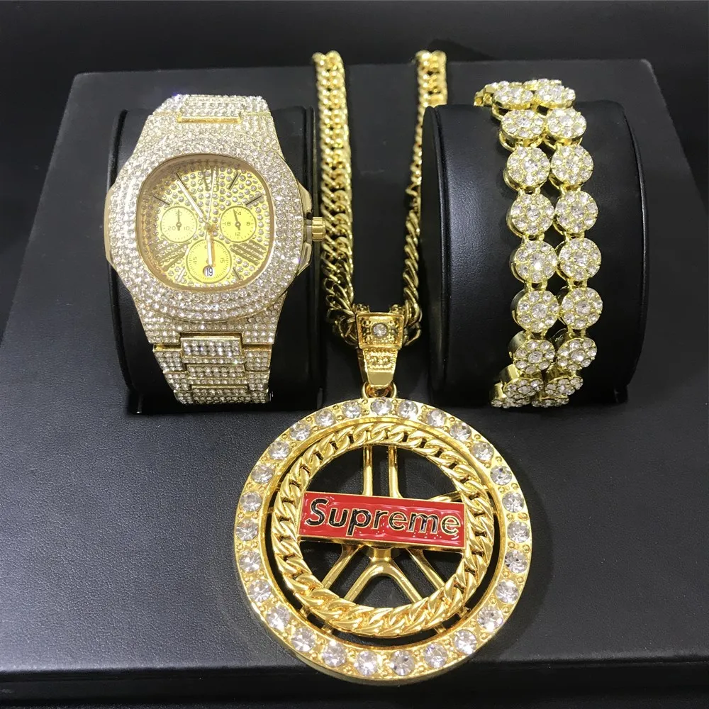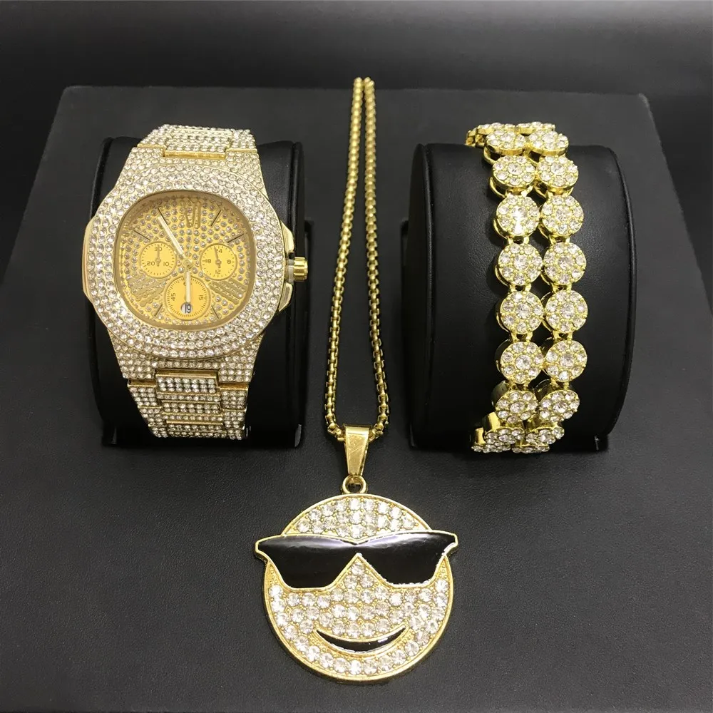 Часы: 100% Новый бренд Лабораторные алмазы камни на браслете Задняя часть из нержавеющей стали Позолоченный Механизм: кварцевый японский Батарея входит в комплект. Размер Чехла: 43 мм (диаметр) Вес: 120 г Замок: складывается Пол: мужские Съемные звенья (регулируемые) Роскошный стиль Упаковочный лист 1 * часы 1 * ожерелье 1 * браслет 1 * Подарочная коробка в комплекте Браслет: Браслет из нержавеющей стали в стиле хип-хоп знаменитостей 14K золотое покрытие из нержавеющей стали Высокое качество