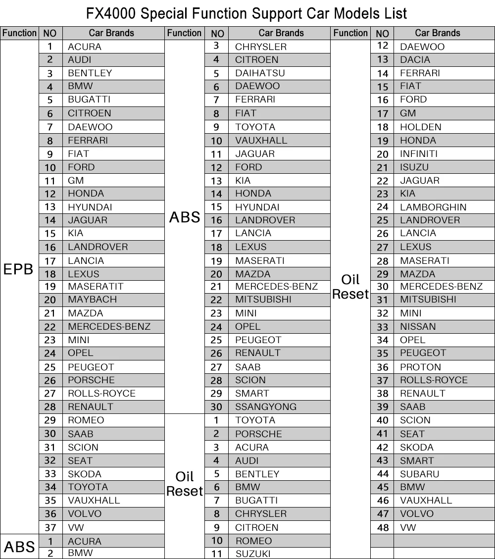 Юридический отказ от ответственности 1.FX4000 является кодовым считывателем для полных систем, не может выполнять Расширенные функции, такие как сброс и программирование. Просто можно сбросить масляную лампу на некоторых моделях автомобилей, не все. 2. Usb-кабель используется только для обновления. Вы можете найти серийный номер на задней части устройства или основной интерфейс «О», вам нужно подключить его к вашему автомобилю, чтобы вы могли прочитать серийный номер. 3. Не все транспортные средства поддерживают считывание всех данных. Показания поддерживаются в зависимости от того, что установлено производителем на системе OBDII. 4. Этот Автомобильный сканер может диагностировать только автомобили 12 В и грузовики 12 В 5. Список поддержки и функции конкретной модели автомобиля: вы можете обратиться к прилагаемым документы в технической спецификации. Или отправьте нам сообщение. Если есть какие-либо вопросы при использовании нашего продукта, пожалуйста, сначала сообщите нам, мы постараемся сделать все возможное, чтобы решить эту проблему для вас. Спасибо!