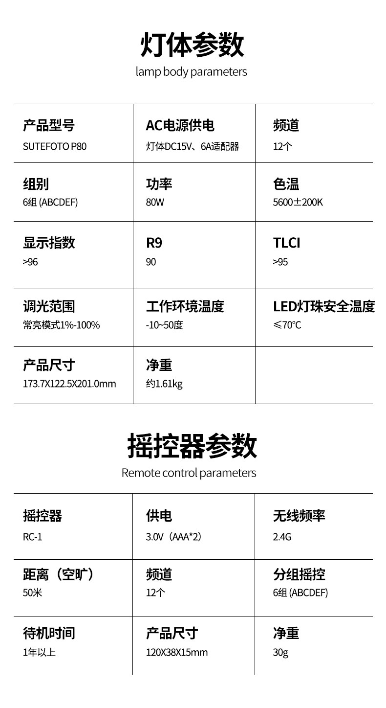 • Беспроводной пульт дистанционного управления 2,4G, поддержка 6 групп 12 каналов 】 Поддержка беспроводного радиопульта s 2,4G (пульт дистанционного управления входит в комплект), Диапазон беспроводного управления ≥ 50 м. С 6 каналами 12 групп, Sutefoto P80 поддерживает мульти-светильник и режим мульти-дистанционного управления, любой светильник или регулятор регулировки могут быть синхронизированы на все светильник s в одном канале и той же группе.