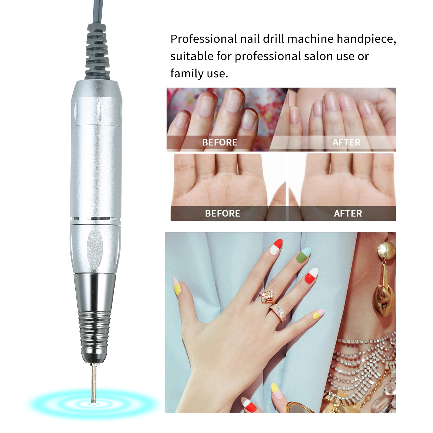 Простота в эксплуатации-легко менять сверло, новичок также может выбрать его. Эргономичная ручка захвата, удобно держать, хорошо для работы. Профессиональный наконечник для маникюрной машинки, подходит для профессионального использования в салоне или для семейного использования.