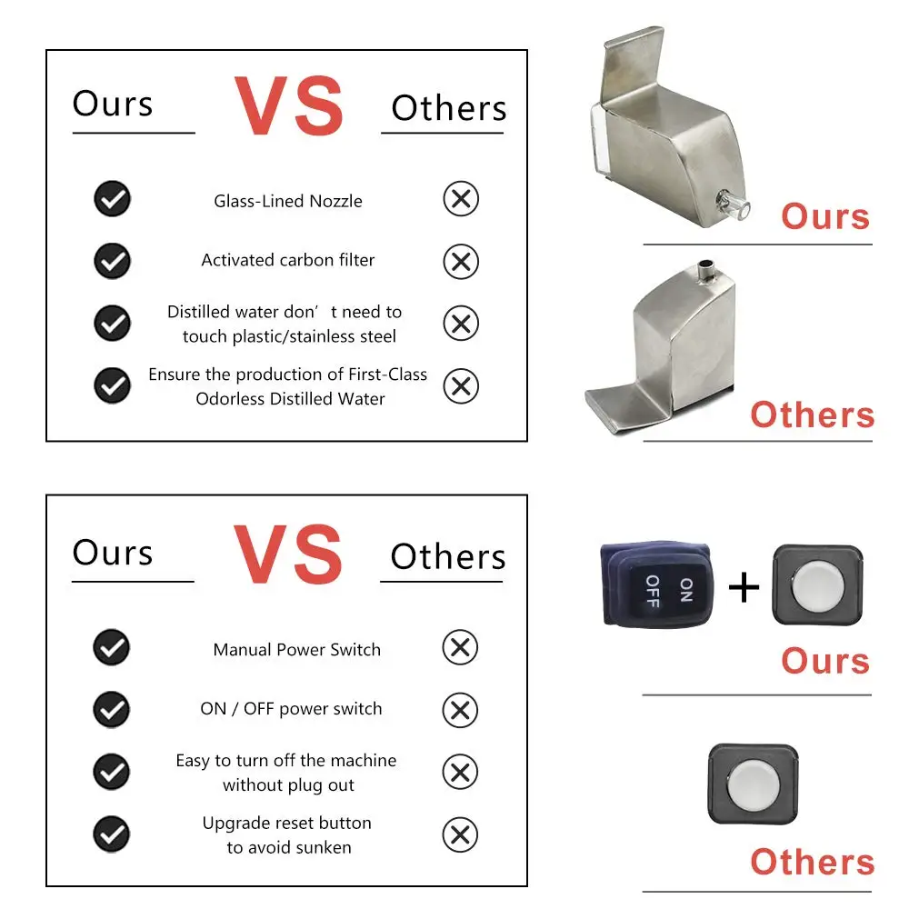 Ручной выключатель питания--- Отличается от всех дистилляторов воды на рынке, наш товар с ручным включением/выключением питания на задней части машины. легко отключать питание с помощью ручного включения/выключения питания во время дистилляции, и нет необходимости подключать и подключать.