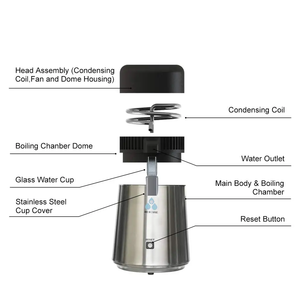Чистый водный процесс--- Кипящая камера (нержавеющая сталь 304) & rarr; конденсаторная катушка (нержавеющая сталь 304) & rarr; удлиненная сопло со стеклянной подкладкой & rarr; стеклянный графин. Дистиллятор 1 галлон каждые 4 часа. Дистиллирует воду при температуре 212 градусов по Фаренгейту, которая является правильной температурой для удаления нежелательных токсинов и загрязнений.