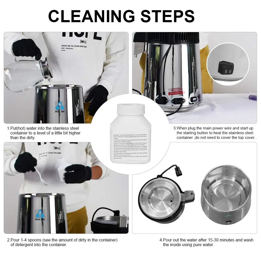 Лучшее качество--- Встроенный внутренний бак из нержавеющей стали 304, со стеклянным фильтром и фильтром с активированным углем, дистиллированная вода не должна касаться пластика/нержавеющей стали, эффективно удалить фторид, нитрат, и других вредных промышленных металлов и минералов в воде. Гарантируем лучшее качество дистиллированной воды.