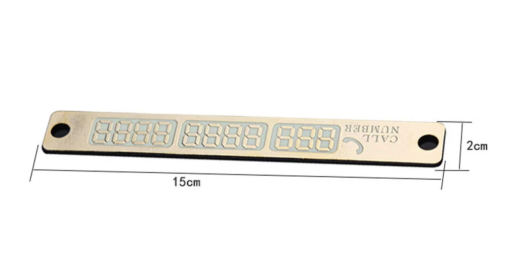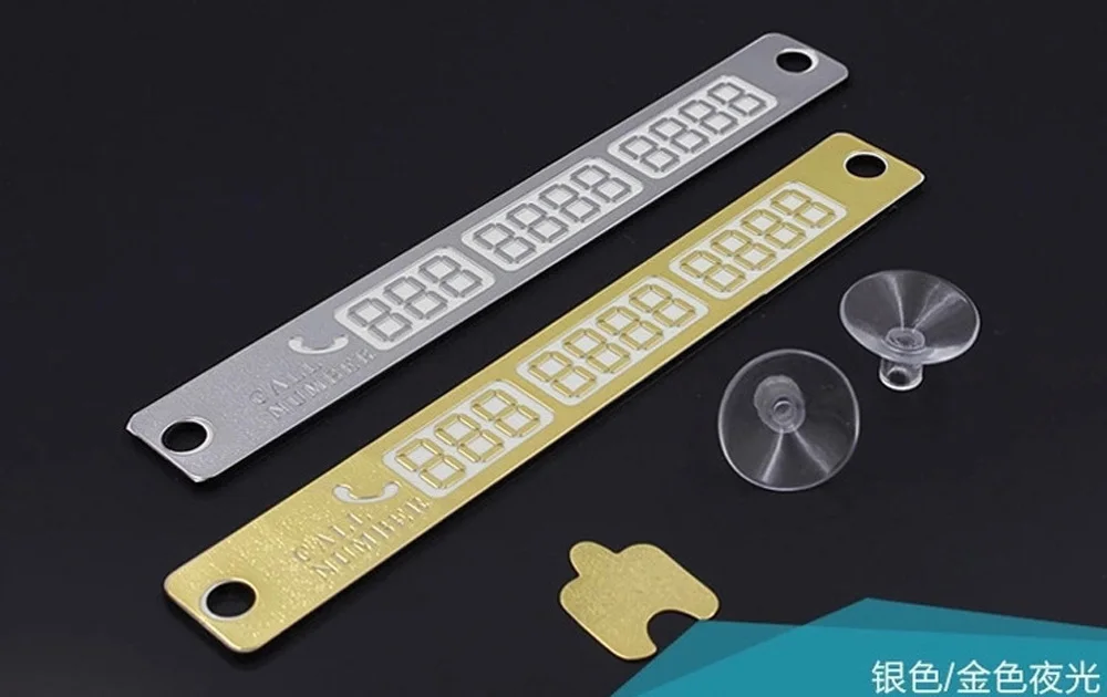 Features: * Luminous temporary parking stop sign, the number can be saw clearly at night. * Made of native rubber material, strong adsorption, not easily drop. * Using super bright ABS material, has a very good decorative effect. Specification: Type:Car Temporary Parking Sign Material :ABS Item Color:Silver / Gold Size: 15*2cm / 5.9*0.8" Net Weight: 0.008kg / 0.3oz Package Included: 1 x Temporary Parking Card 2 x Suckers 1 x Tool