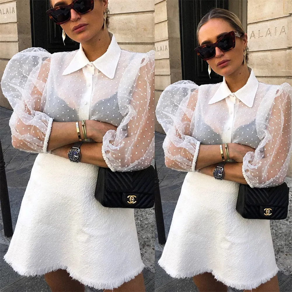Женские прозрачные блузки в горошек с длинным рукавом и буфами, Рубашки, Топы, прозрачные женские блузки на пуговицах