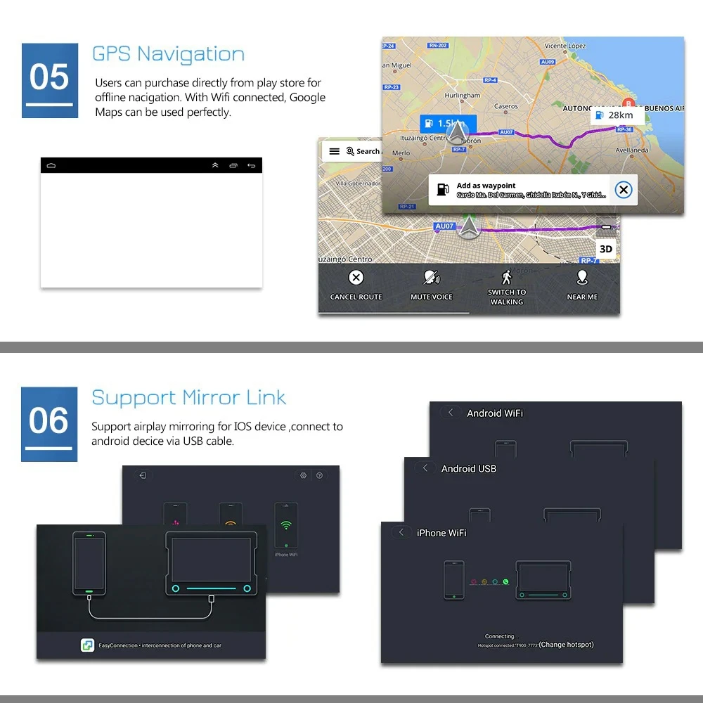 Встроенный WIFI: Подключитесь к WIFI, и вы найдете новый мир, самый удобный-это онлайн-карта. Обучение рулю: через него вы можете управлять функциями, которые вам нужны, с помощью руля, более удобным; Встроенный GPS приемник, совместимый с Waze/Navfree/Google Map и т. Д.: с тех пор, пока есть место назначения, вы можете пойти куда угодно и никогда не потеряться снова! Встроенная флэш-память 16G для музыки/навигационной карты Данные/видео