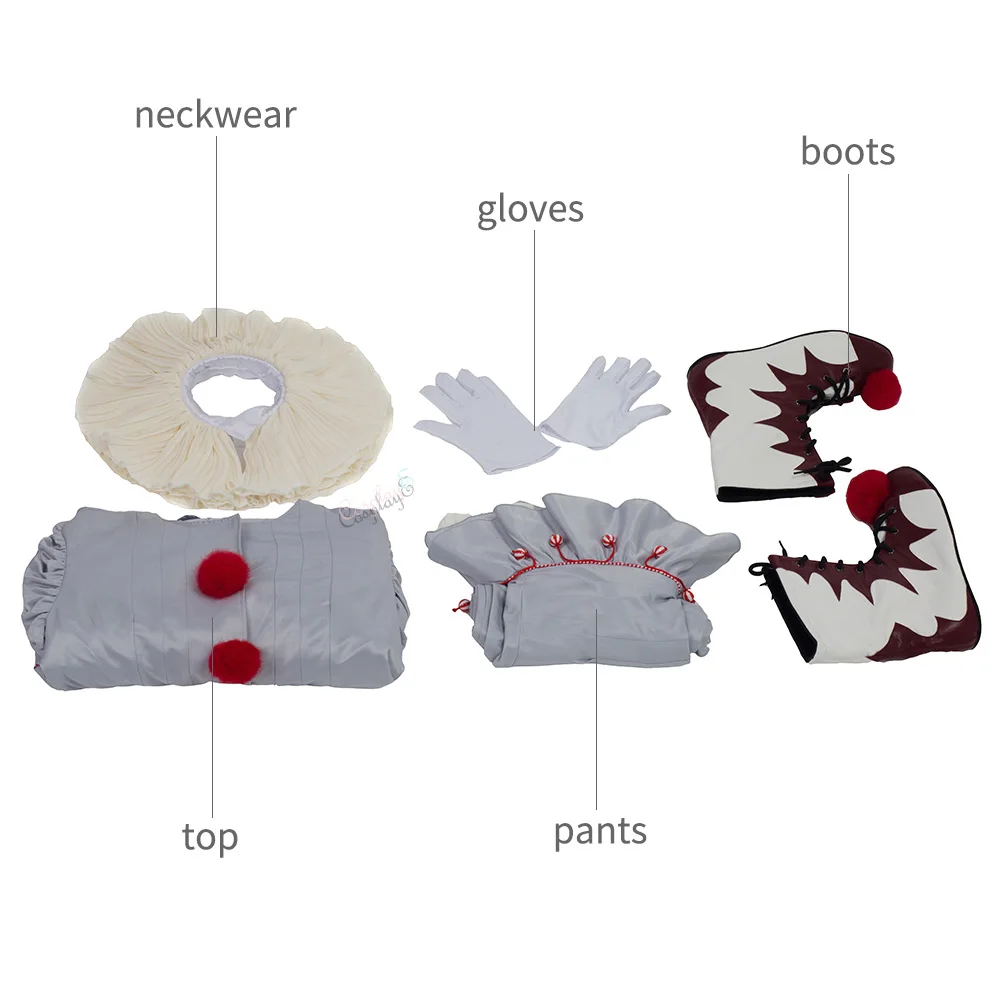 Фильм: 2017 Стивен Кинг это Персонажи: Танцевальные Костюмы Клоуна Посылка включает в себя: топ, брюки, шейный платок, перчатки Материал: хлопок, шифон, искусственная кожа, трикотаж, атлас Вес: 2,4 Кг