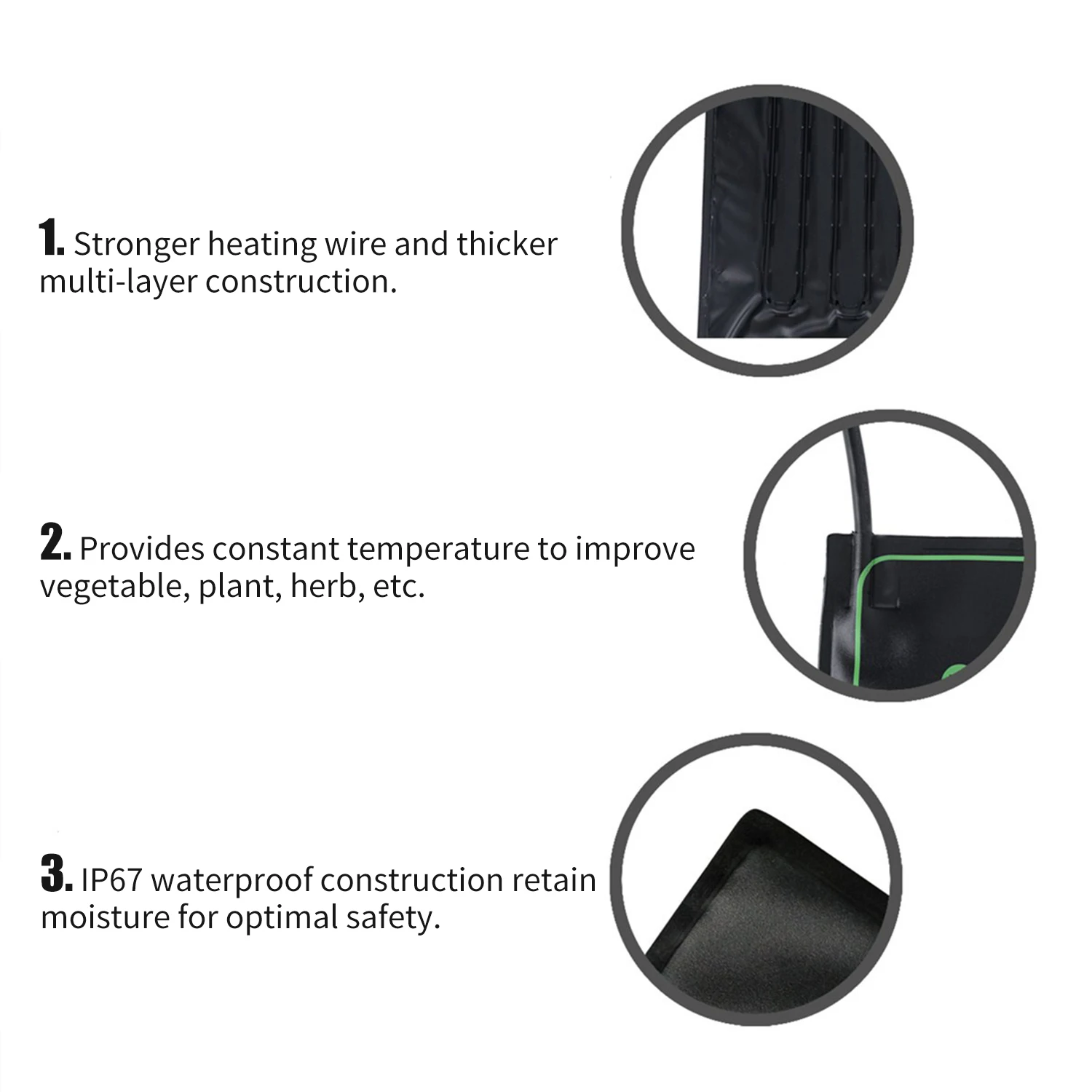 Нагревательный коврик для рассады имеет прочную конструкцию, водонепроницаемую и удобную очистку. Нагревательный коврик для рассады для лучшего роста растений и прорастания семян цветов. Одиночная цепь обеспечивает постоянную температуру и увеличивает успех саженцев и черенков. Идеально подходит для сеялки, прорастания, домашнего пивоварения и домашнего животного ограждения террариумов.
