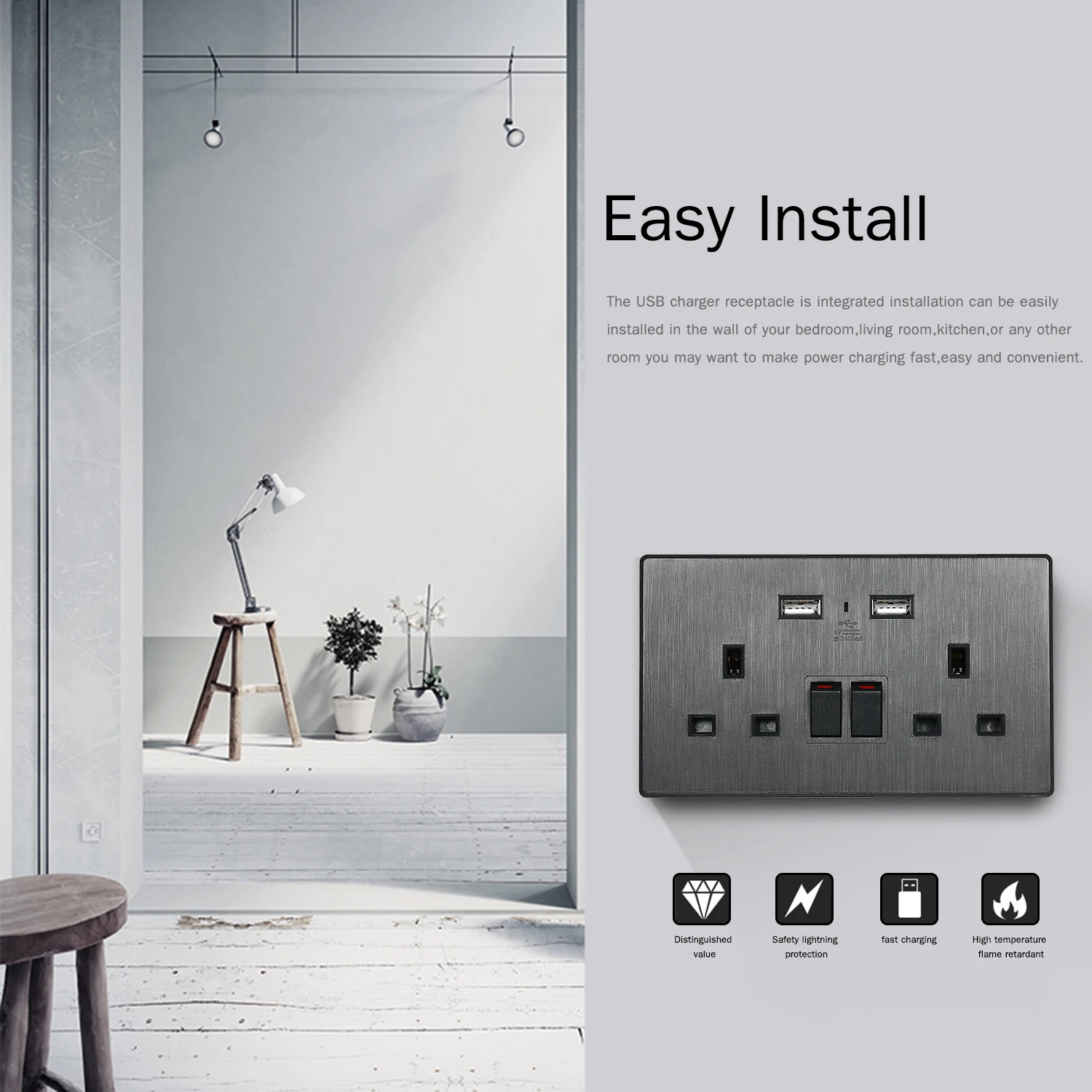 Простая установка: зарядное устройство USB интегрированная установка может быть легко установлена в стене вашей спальни, гостиной, кухни или любой другой комнаты, вы можете сделать зарядку питания быстро, легко и удобно.