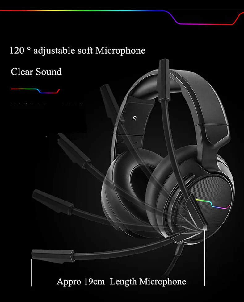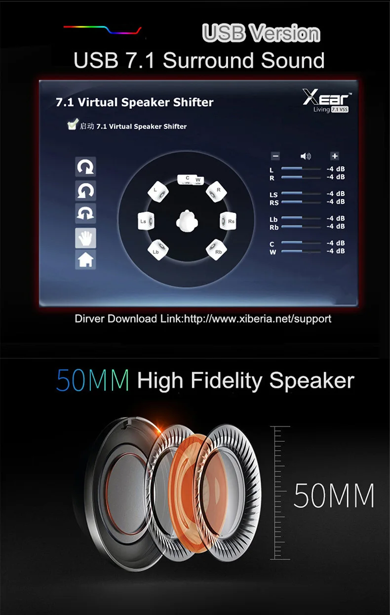 1. Двойные драйверы 50 мм обеспечивают четкий, насыщенный звук 2. Мягкие звукоизоляционные наушники обеспечивают длительный комфорт при ношении 3. Повязка на голову с подвеской, предназначенная для длительного комфорта 4.7.1 драйвер виртуального объемного звука, обеспечит вам Захватывающий игровой опыт и улучшит звуковой эффект