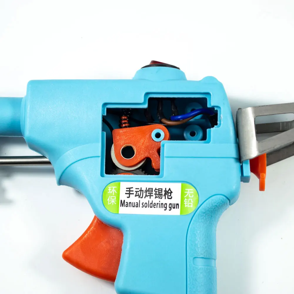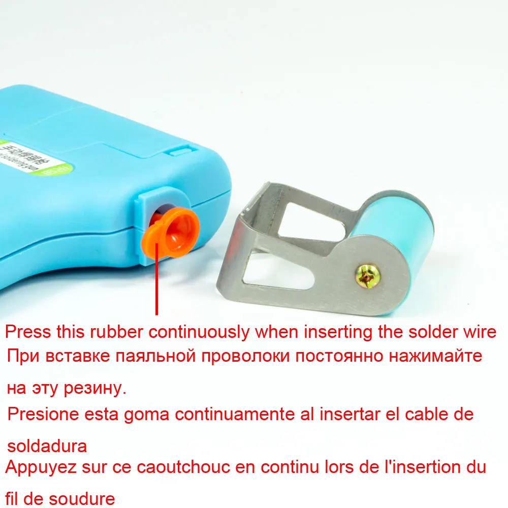 1. Нажмите на вход олова, вставьте оловянную проволоку в отверстие, затем потяните триггер, пока Олово не достигнет кончика металлической трубки. 2. Подключите и включите его, чтобы разогреть пистолет. 3. Начните работать с ним до тех пор, пока Подогрев не будет в порядке.