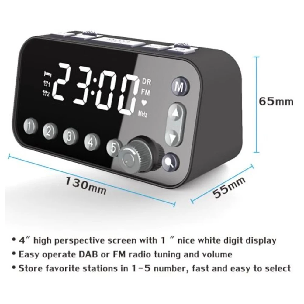 Этот радиоприемник имеет большой размер светодиодного дисплея, легко смотреть время, особенно для пожилых людей. С помощью этого устройства вы можете наслаждаться радио DAB и fm-радио. Радио можно установить как таймер будильника, и вы можете установить два таймера будильника для отключения в разное время.
