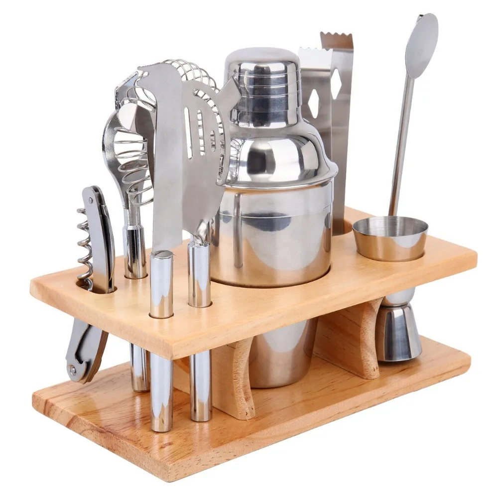 8 штук в комплекте: шейкер, двойной мерный стаканчик, ситечко, открывалка для бутылок, нож для нарезки лимона/лайма, Тонг, мешалка и деревянная подставка.