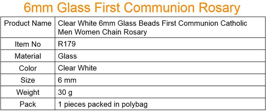 Прозрачные белые 6 мм стеклянные бусины для первого причастия католические Мужчины Женщины Мужчины цепочка Розарий Номер товара: F179R Материал: Стекло Цвет: прозрачный белый Размеры: 6 мм Вес: 30 г Упаковка: 1 шт. упаковано в полиэтиленовый пакет