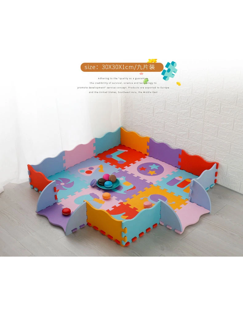 Название: напольный коврик пазл Материал: материал защиты окружающей среды EVA Размер: 30*30*1 см (одна штука) Подходящий возраст: ребенок старше 2 месяцев Упаковка: Экологически чистая термоусадочная пленка Размер упаковки: 30*30*16 см Изделие содержит: 9 ковриков + 12 кромок + 4 уголка Вес изделия: 1 кг