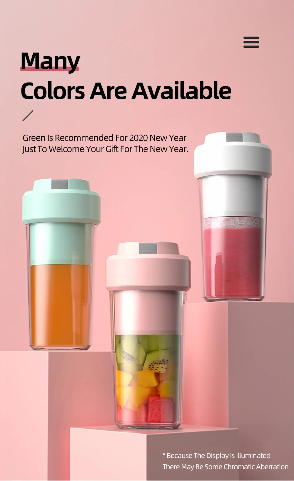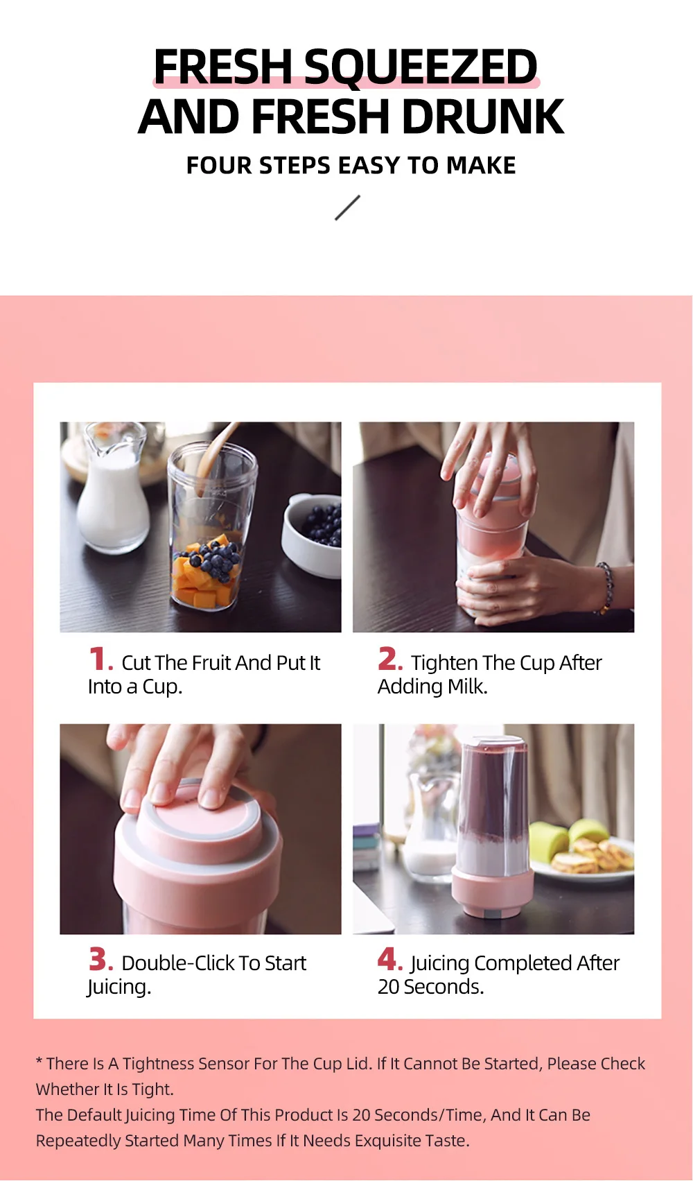 1. Легкая и портативная бутылка для приготовления сока для путешествий на открытом воздухе. 2. Полностью скрытые лезвия резака, Бесплатная и быстрая работа DIY. 3. Магнитный способ зарядки, Автоматическое отключение питания. 4. Сохраняет оригинальный вкус и вкус.