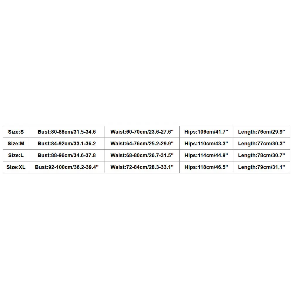 Size Bust Waist Hips Length S 80-88cm/31.5-34.6 60-70cm/23.6-27.6" 106cm/41.7" 76cm/29.9" M 84-92cm/33.1-36.2 64-76cm/25.2-29.9" 110cm/43.3" 77cm/30.3" L 88-96cm/34.6-37.8 68-80cm/26.7-31.5" 114cm/44.9" 78cm/30.7" XL 92-100cm/36.2-39.4" 72-84cm/28.3-33.1" 118cm/46.5" 79cm/31.1" Size:S Bust:80-88cm/31.5-34.6 Waist:60-70cm/23.6-27.6" Hips:106cm/41.7" Length:76cm/29.9" Size:M Bust:84-92cm/33.1-36.2 Waist:64-76cm/25.2-29.9" Hips:110cm/43.3" Length:77cm/30.3" Size:L Bust:88-96cm/34.6-37.8 Waist:68-80cm/26.7-31.5" Hips:114cm/44.9" Length:78cm/30.7" Size:XL Bust:92-100cm/36.2-39.4" Waist:72-84cm/28.3-33.1" Hips:118cm/46.5" Length:79cm/31.1"