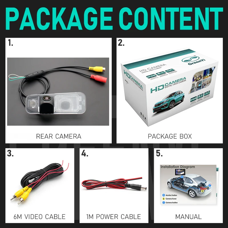 1. Rear view camera 2. Package box 3. 6M video cable 4. Power cable 5. Manual