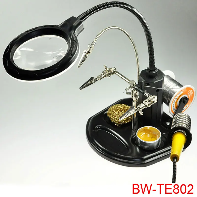Net weight: 0.64kg Base is made of cast iron, it is very solid. Multi-directional auxiliary clamping, amplification, transformation are barrier-free. With 5 times optical magnifier, can be used in SMD circuit. Magnifying glass, double mechanical arm, compact clamp, these three parts can be rotated in any direction, used for mobile phone maintenance, microelectronics field, it is a precision maintenance tool.
