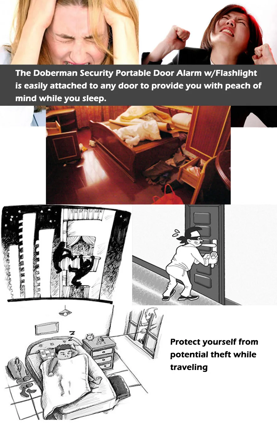 Защитите себя от потенциальной кражи во время путешествия. Переносная дверная сигнализация Doberman Security с фонариком легко крепится к любой двери, чтобы обеспечить вам душевное спокойствие во время сна. Просто Повесьте его от дверной ручки и поместите зажим в дверной косяк. Это идеальная сигнализация для гостиничных номеров, общежитий или любой комнаты, которую вы хотели бы охранять. Также встроен удобный фонарик.
