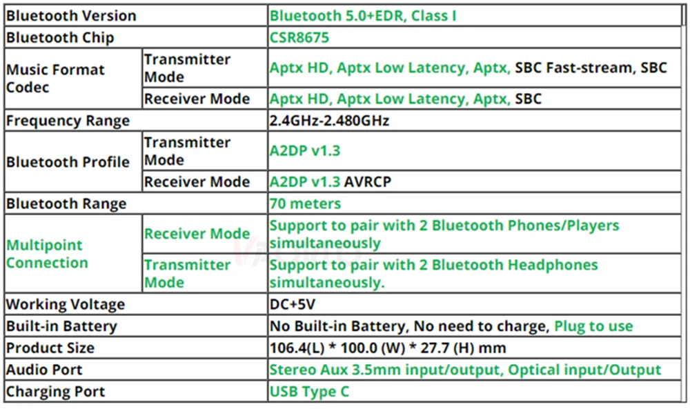 1) чтобы достичь aPtx, aPtx с низкой задержкой или aPtx HD с помощью этого bluetooth-адаптера, убедитесь, что ваши bluetooth-устройства также поддерживают aptx. 2) Этот bluetooth-адаптер поддерживает двойную связь, сопряжение с 2 bluetooth-плеерами или мобильными телефонами или планшетами и так далее в любом коде музыкального формата, И Поддержка сопряжения с 2 bluetooth-наушниками в Aptx с низкой задержкой, Aptx, SBC с кодом музыкального формата, Не может соединиться с 2 bluetooth-наушниками в формате Aptx HD Music Codec. 3) Если вы соединились с 1 Bluetooth aptx наушники HD, и попытайтесь соединить второй Bluetooth Aptx наушники HD, то 2 Bluetooth Aptx наушники HD переключаются на SBC формат музыки. 4) Нет встроенного микрофона, поэтому данное устройство не поддерживает звонки по громкой связи. 5) Этот bluetooth-адаптер может соединяться с 2 bluetooth-зарядными планшетами или мобильным телефоном, но может передавать музыку только с 1 из 2. Если вы хотите Переключить другой, вам нужно приостановить 1-й звук и воспроизвести 1-й источник звука. Этот bluetooth-адаптер не может передавать 2 источника звука одновременно в качестве bluetooth-приемника.