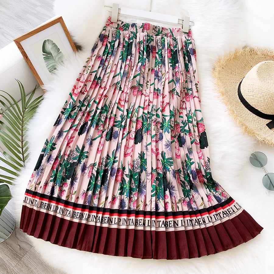 Длинная юбка миди с цветочным принтом, женская летняя юбка WF0028, Женская винтажная плиссированная юбка розового и зеленого цвета в стиле ретро