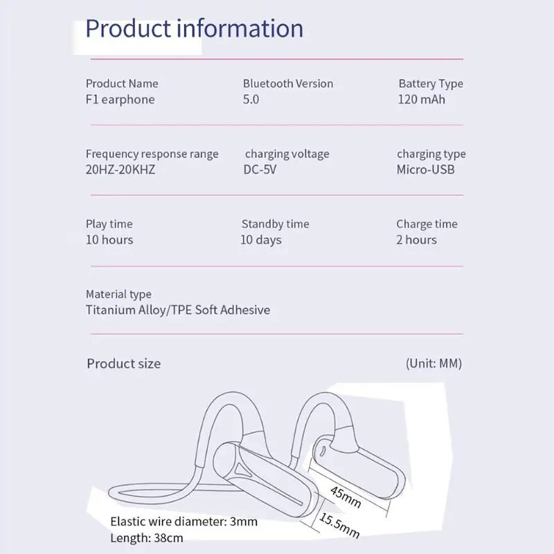F1 наушники-вкладыши TWS Bluetooth совместимым 5,0 костной проводимости Беспроводной спортивные наушники Водонепроницаемый гарнитура Хэндс фри, стерео гарнитура для фитнеса