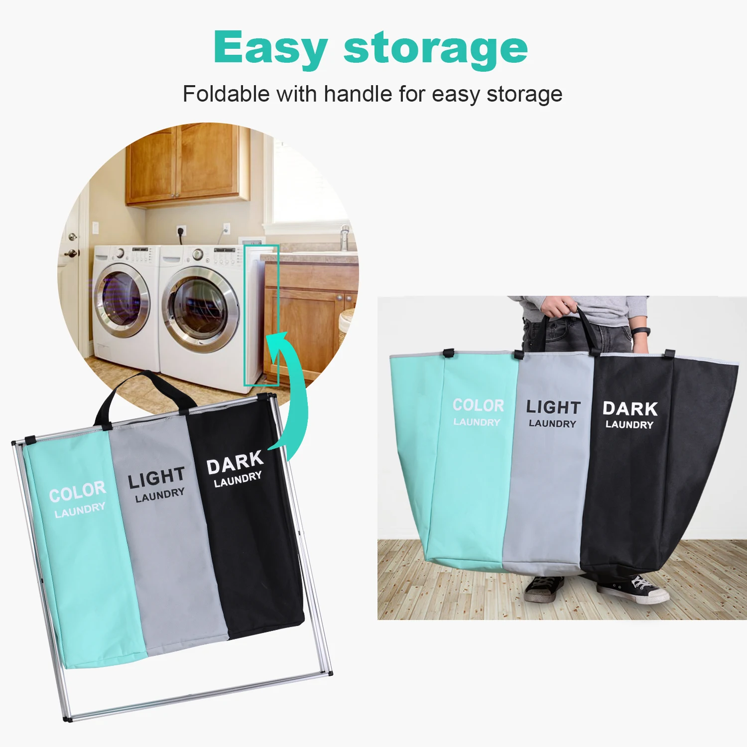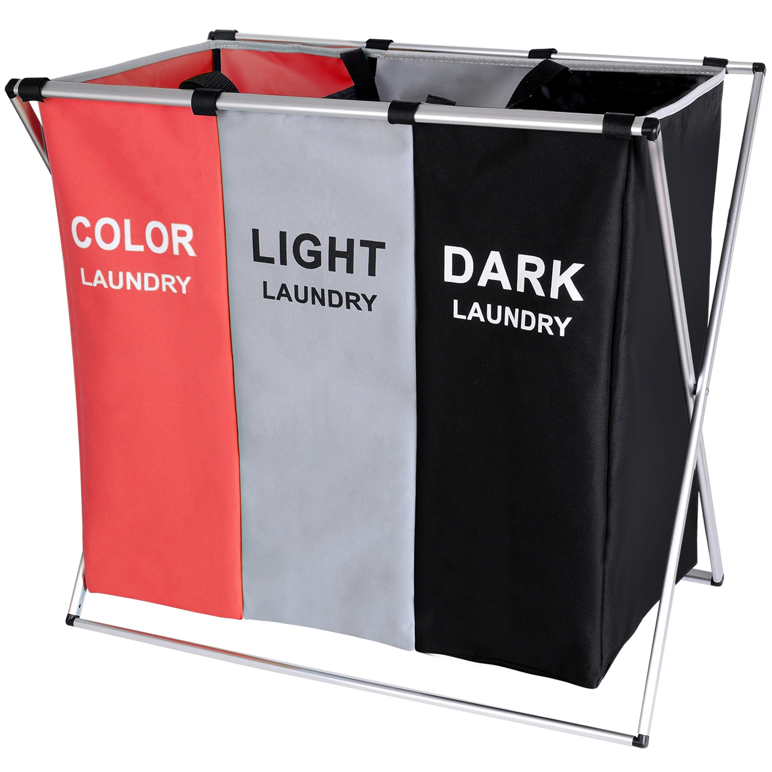 3 секции большой емкости-разделены на 3 секции, так что вы можете сортировать свой темный, цвет от светильник, как вы падение одежды в корзину. Каждая сумка для стирки может вмещать до 2 стандартных размеров