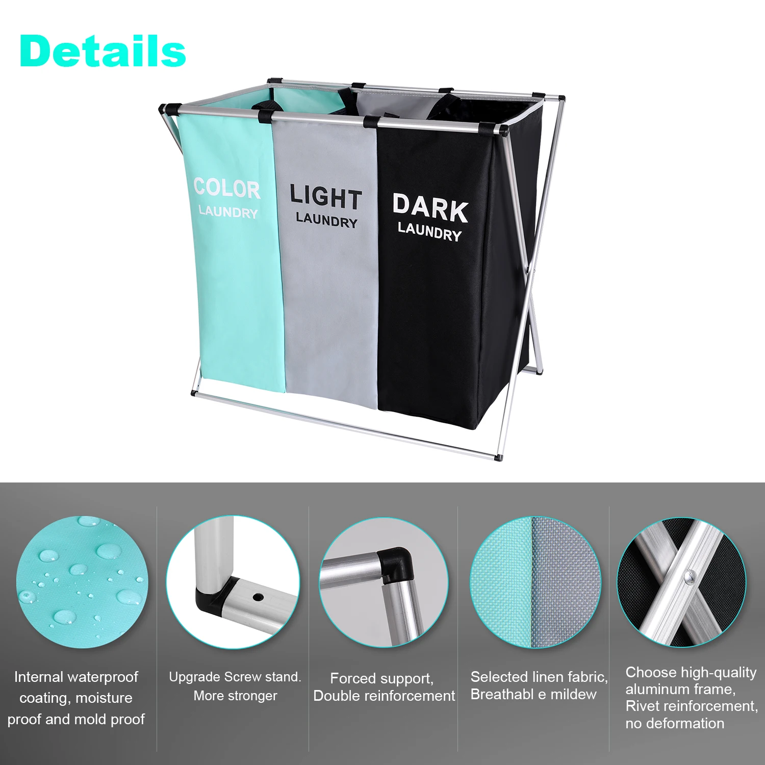 135L корзина для белья, Сортировочная корзина, складная, 3 секции с алюминиевой рамой 62 см × 37 см x 58 см, сумка для грязной одежды для ванной комнаты, спальни, дома