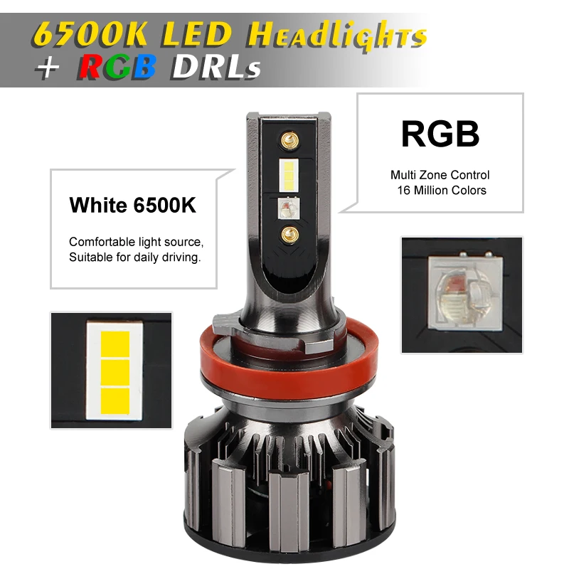 2-в-1 светодиодный головной светильник комплект plus RGB дневные ходовые огни светильник встроены в один комплект. Контролируйте 16 миллионов цветов для ваших DRL на кончиках пальцев с помощью смартфона. Красочный светильник-приложение самостоятельно контролирует светодиодный чип RGB DRL (доступен для устройств Android и iOS) Внутренний модуль кодировщика плюс двойной ASIC чипсет позволяет отделять, а ошибки и мерцания без фар. Отсканируйте код в линейной коробке, чтобы загрузить приложение для контроля цвета светильник. Максимальная мощность: 72 Вт/комплект 36 Вт/лампа Люмен: 9600 лм/комплект. 4800LM/лампа Светодиодный цвет фары: 6000K белый Функция цвета DRL: многоцветный Модель разъема: дальний и ближний свет H4, сингель-луч H7.