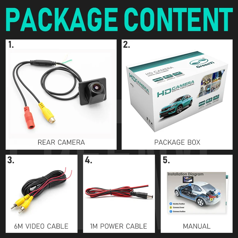 1. Камера заднего вида 2. Коробка для посылка 3. Видео кабель 6 м 4. Кабель питания 5. Руководство пользователя