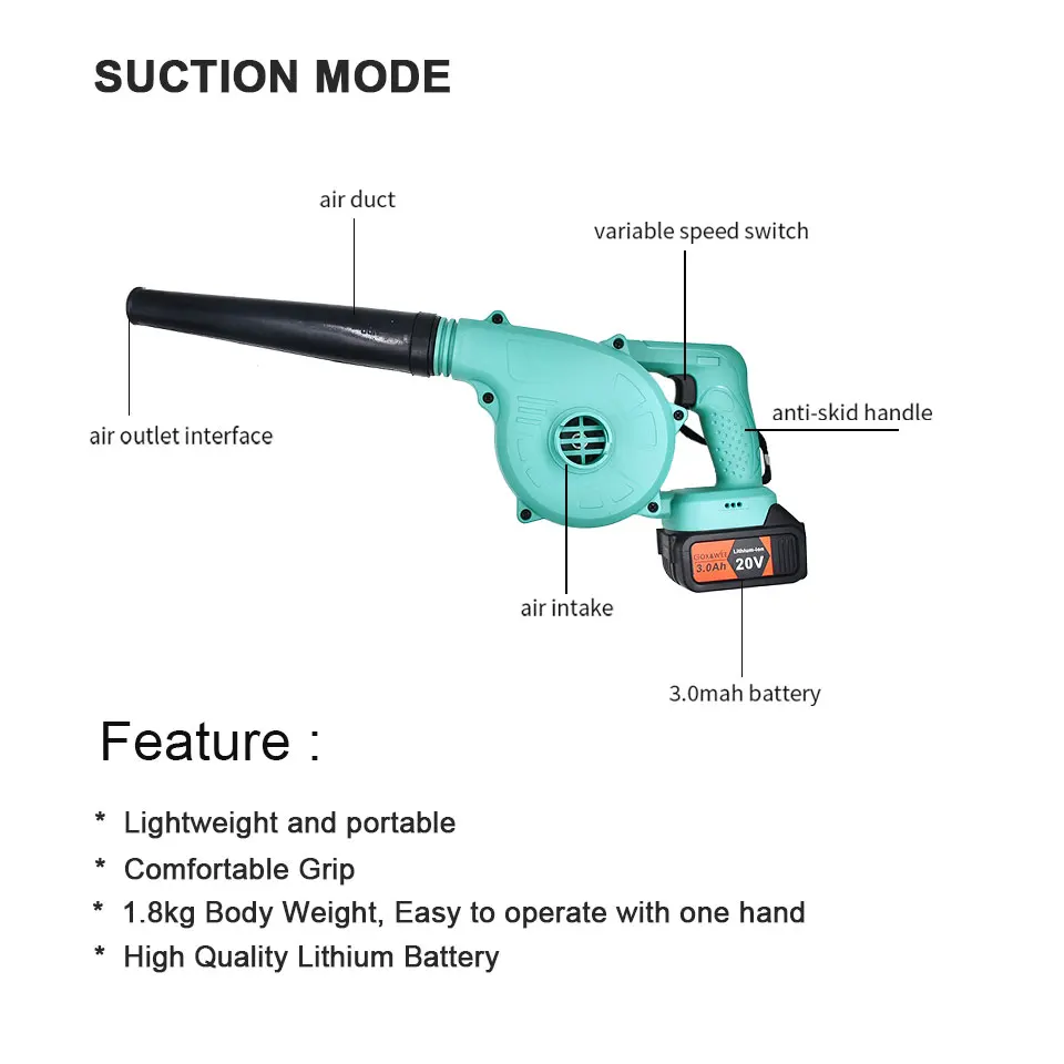Параметры: -Адаптер питания: Европейское правило, две круглые вставки -Объем воздуха: 3 (кубический/мин) -Напряжение зарядки: 220 В, вилка европейского стандарта -Скорость без нагрузки: 0-19000об/мин -Время зарядки: около 1,5 часов -Функция: всасывание, выдувание воздуха -Питание: литий-ионный аккумулятор -Тип: беспроводной воздуходувка Особенности: -Функция всасывания, свободная, легко управляется с любым углом дома. -Высокомощный двигатель с технологией постоянной температуры используется для обеспечения стабильной работы при высокой интенсивности работы. -Корпус изготовлен из качественного материала, который может предотвратить старение машины. -Поставляется с паяльной трубой и пылесборником в комплекте. -С Воздушным выдувом и функциями сбора пыли. -Беспроводная работа, более безопасная. -Медный сердечник высокой мощности обеспечивает Мощное всасывание и ветер -Легкий и ручной дизайн, легко носить и управлять. -Очистите пыль материнских плат, чехол для компьютера и источник питания. Легко очищает пыль/волосы от отходов постельного белья, углов, кроватей, Ковров, мебели и т. Д. -Эргономичный дизайн, нескользящая ручка, длительное время использования не натирает руки. -Высококачественная литиевая батарея, эффективно повышает эффективность работы, быстрая зарядка, длительное время работы.