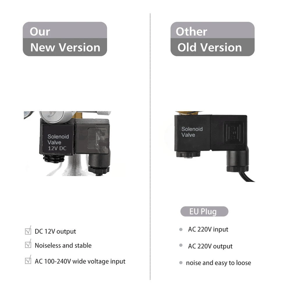 Бесшумный:100-240 в широкий вход напряжения, DC 12 В выход, Соленоидный клапанМодернизированный 12V бесшумная версия.