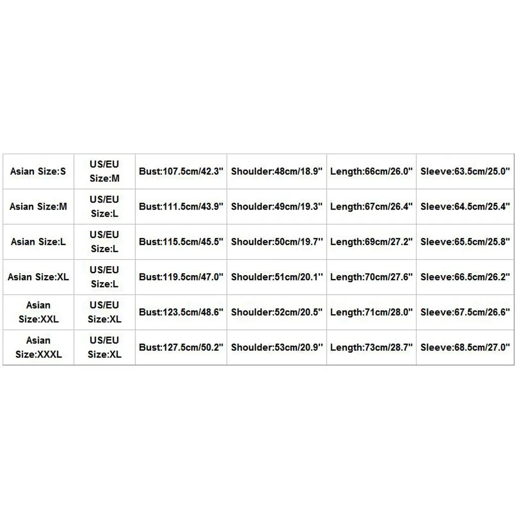 Asian Size US/EU Size Bust Shoulder Length Sleeve S M 107.5cm/42.3" 48cm/18.9" 66cm/26.0" 63.5cm/25.0" M L 111.5cm/43.9" 49cm/19.3" 67cm/26.4" 64.5cm/25.4" L L 115.5cm/45.5" 50cm/19.7'' 69cm/27.2" 65.5cm/25.8" XL L 119.5cm/47.0" 51cm/20.1'' 70cm/27.6" 66.5cm/26.2" XXL XL 123.5cm/48.6" 52cm/20.5" 71cm/28.0" 67.5cm/26.6" XXXL XL 127.5cm/50.2" 53cm/20.9'' 73cm/28.7" 68.5cm/27.0"
