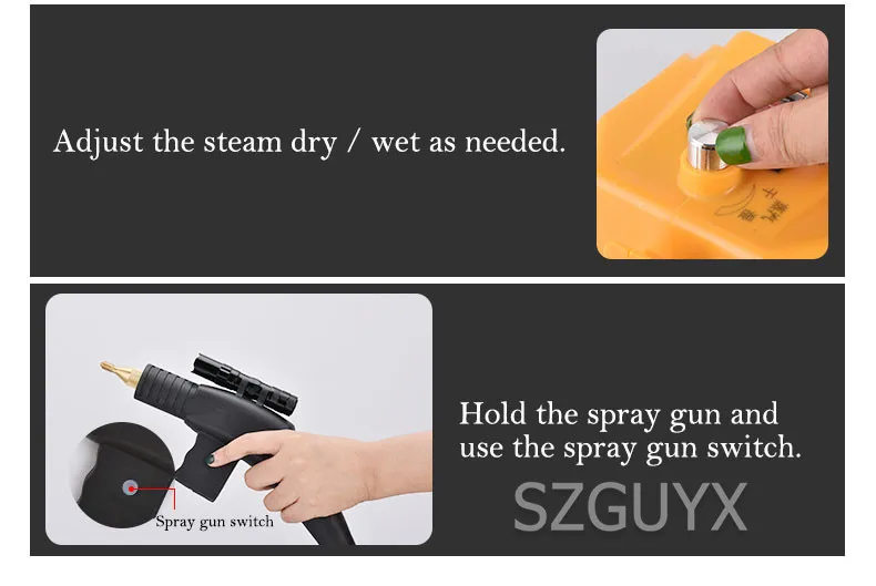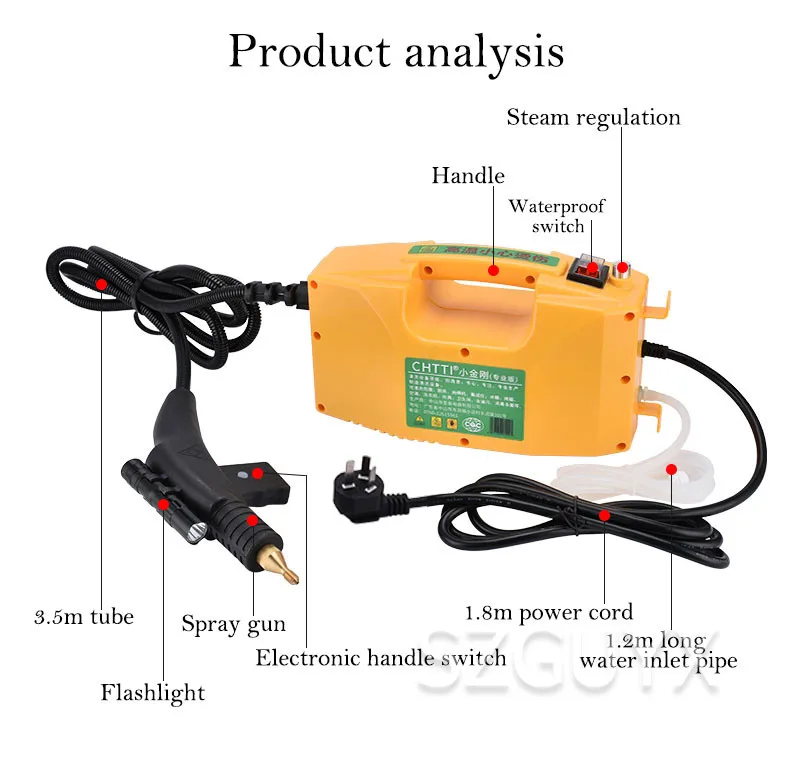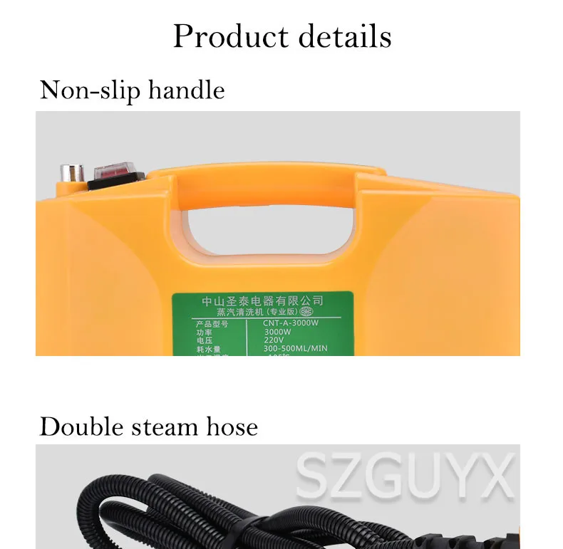 Название продукта: пароочиститель Модель: CNT-A-3000W Мощность: 3000 Вт Напряжение: 220 В Частота: 50 Гц Давление парения: 300-350 кПа Впускная Труба Длина: 1,2 м Размер хоста: 300*130*165 мм Размер упаковки: 36*28,5*21 см Расход воды: 200-500 мл/мин Температура выхода:> 100 ℃, 115 ℃ (самый высокий) Длина шнура: 1,8 м Паровой трубы Длина: 3,5 м Вес нетто: 2,3 кг Вес брутто: 2,9 кг Продолжительность обработки паром: более 30 минут Есть ли функция оповещения о нехватке воды: нет