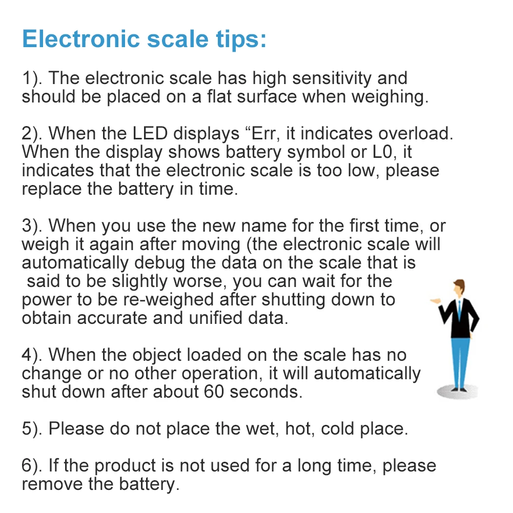 * 3. Когда вы используете весы в первый раз, или взвешиваете его снова после перемещения (электронные весы автоматически отлаживают данные), но данные немного похуже, вы можете повторно взвешивать после выключения для получения точных и унифицированных данных.