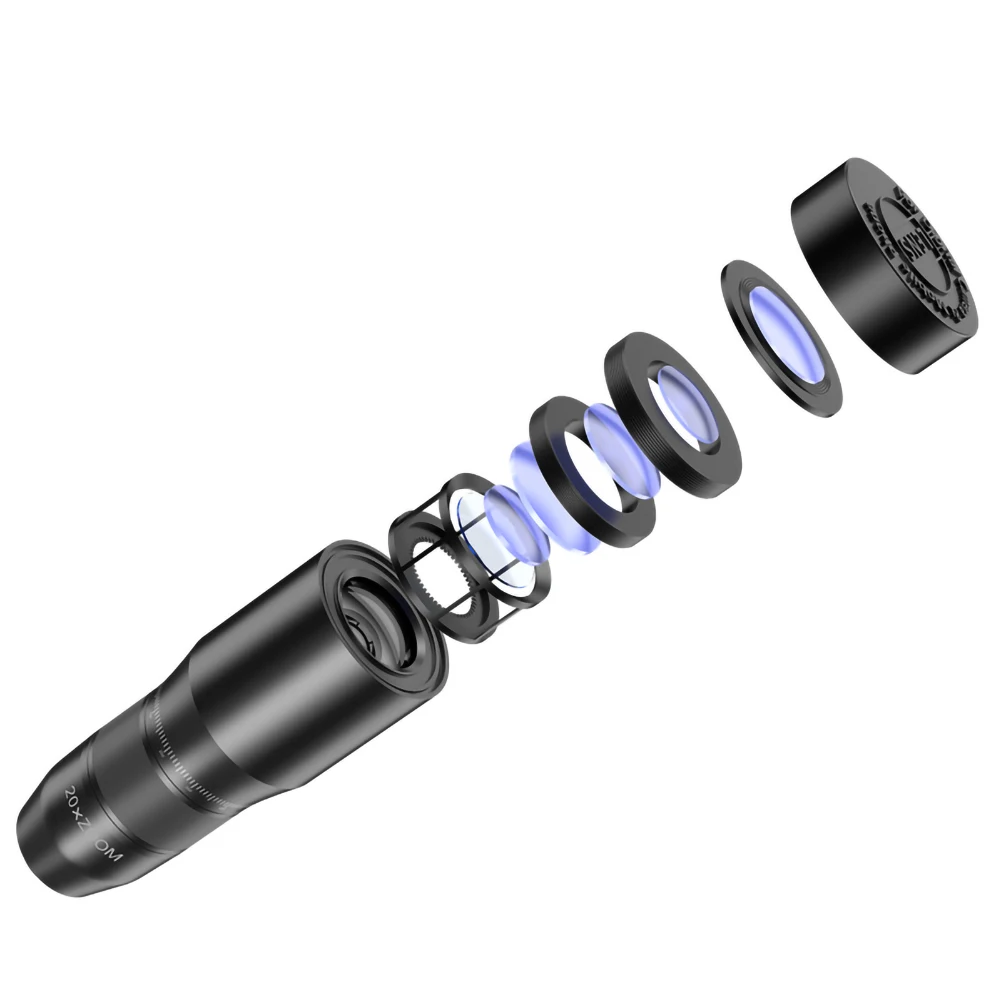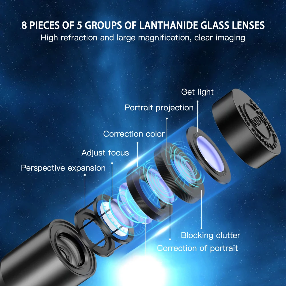 3. Стекло Lanthanum: обновленная оптическая система в 2019 году, кольцо регулировки фокуса, оптическое покрытие lanthanide, корпус из алюминиевого сплава, 8 шт. из 5 групп стеклянных линз lanthanide, высокая преломляемость и большое увеличение, И четкое искажение изображения.