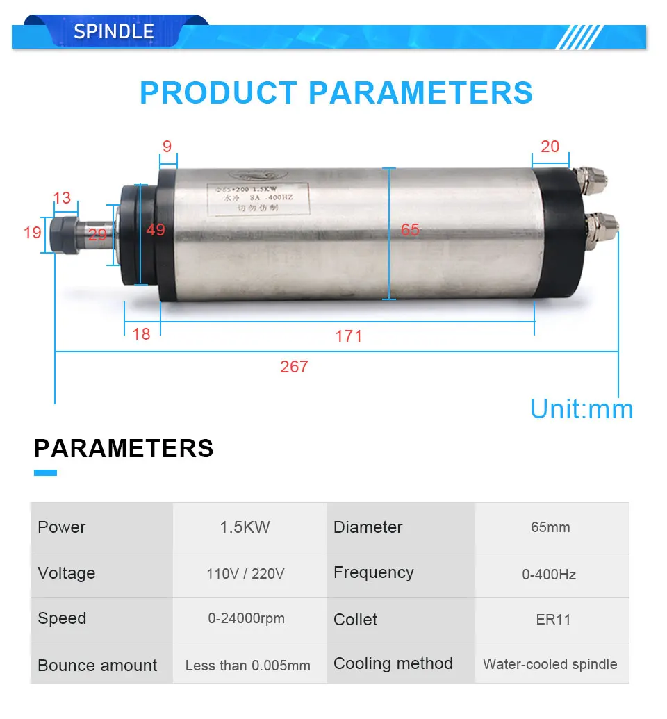CNC 1,5 кВт 6565 мм шпиндель с водяным охлаждением для гравировки/фрезерного станка
