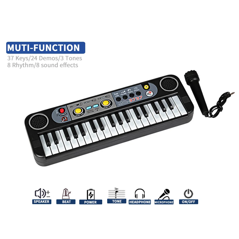 Характеристики: 1. Великолепные характеристики Это электронное пианино имеет отличные характеристики, в том числе 3 тона, 8 ритмов, демонтажей, а также с регулировкой скорости и громкости. На батарейках, подходит для внутреннего или наружного использования. 2. Высокое качество Это пианино имеет прочное пластиковое строение и компактный размер. Это изделие изготовлено из чистой цветной ткани, которая проста и легка, и удобна в переноске. 3. Мини-микрофон С мини-микрофоном, дети могут играть во время пения. Это может быть очень забавно для вашего ребенка. Кроме того, изысканные 37 черно-белые клавиши имеет свои функции и легко работают. 4. Идеальный подарок. Он стимулирует жизнеспособность детского мозга и музыкальную мощь, которая очень подходит для отработки Детского Музыкального подарка и фантазии и придания удовольствия. Подходит для детей в возрасте от 2 до 5 лет. Характеристики: Состояние на 100% абсолютно новый, высокое качество Материал: АБС-пластик и электронные детали Номер клавиш: 37 Демонстрационная песня: 24 Ключевая заметка: 3 Ритм: 8 Цвет: черный и белый Источник питания: 4 батарейки AA (не входят в комплект поставки) Общий размер: 33,5X10,5X4 см/33,5x10,4x4,1 см Вес: около 376 г Упаковочный лист: 1 электронное пианино 1 х микрофон