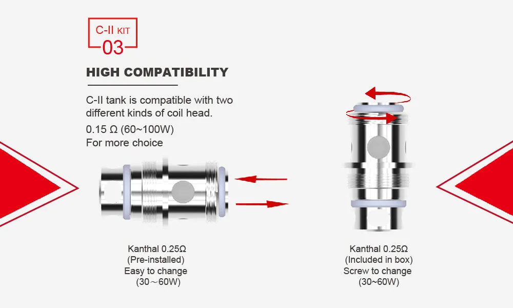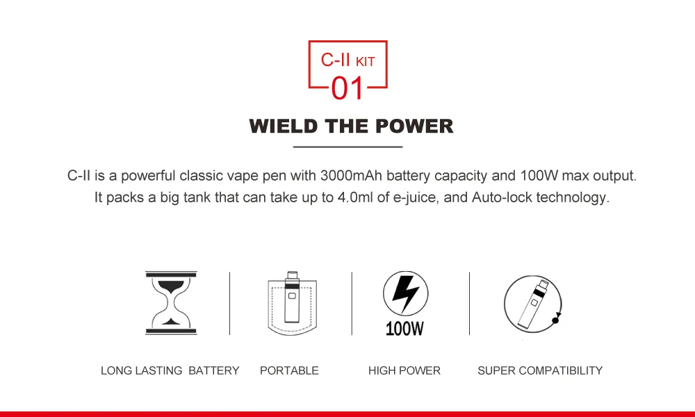 C - II стартовый набор с талией обхватом 30 - 100 Вт Выход с двумя 0,25 Ом катушки. С большой емкостью аккумулятора 3000 мА · ч, ваш опыт вейпинга во время путешествия может длиться долгое время, не заряжаясь часто. Стартовый Набор C - II имеет дизайн одной кнопки с компактным размером, который прост в использовании и удобен для переноски во время путешествий. Бак оснащен регулируемым потоком воздуха в нижней части, что обеспечивает плавный паровой режим.