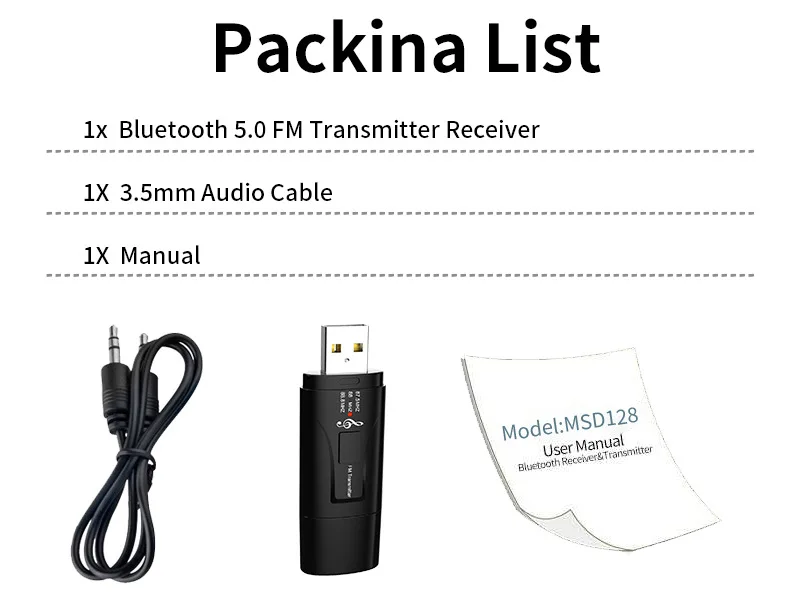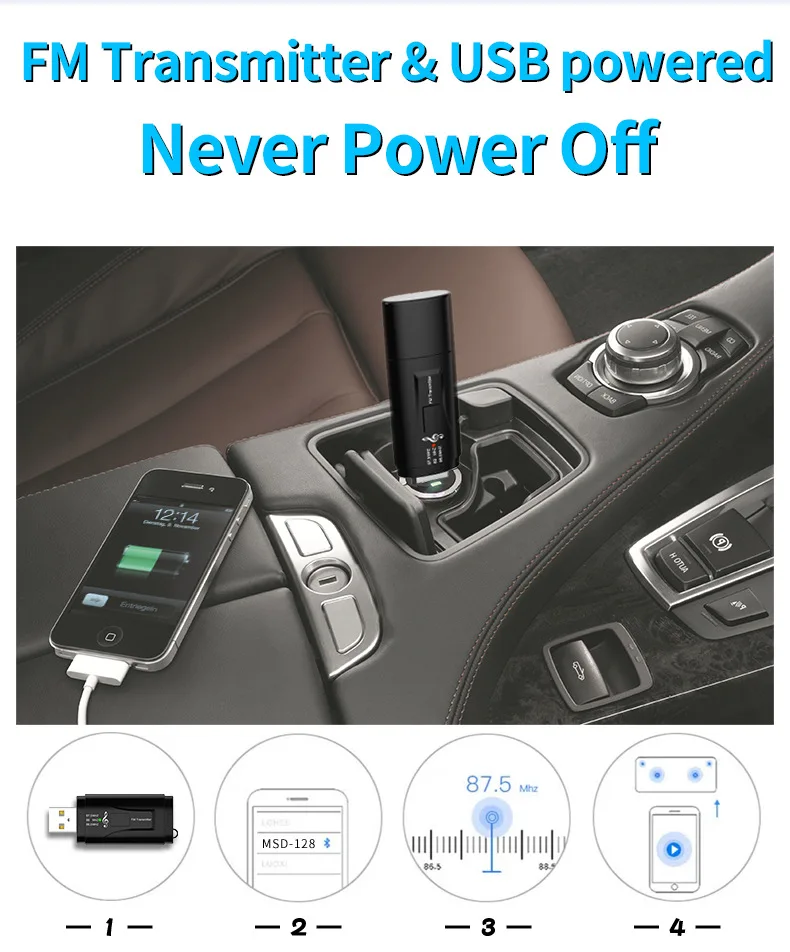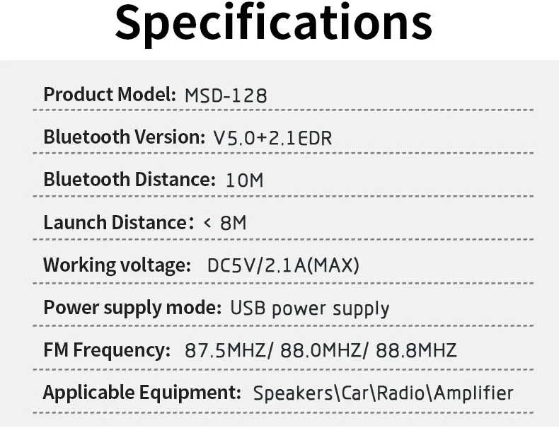 Plug the device into the USB interface, the blue light flashes quickly, and connect the device to the car AUX interface with a 3.5MM audio cable (or plug the audio cable of the speaker into the device). Turn on the phone Bluetooth, and search for the Bluetooth device MSD-128, The blue light flashes slowly after successful connection.