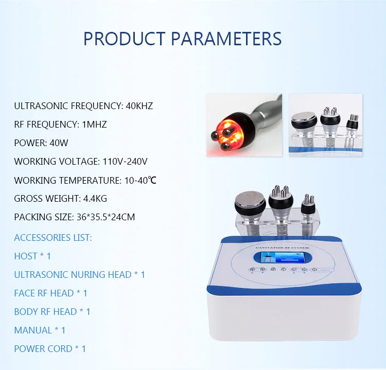 1,40k зонд красоты. Он использует ультразвук 40 кГц для производства множества крошечных вакуумных пузырьков в жире, которые постоянно сжимаются в пузыри под вибрационной волной, который эффективно разлагает и расплавляет жировые клетки, для достижения реального эффекта похудения.