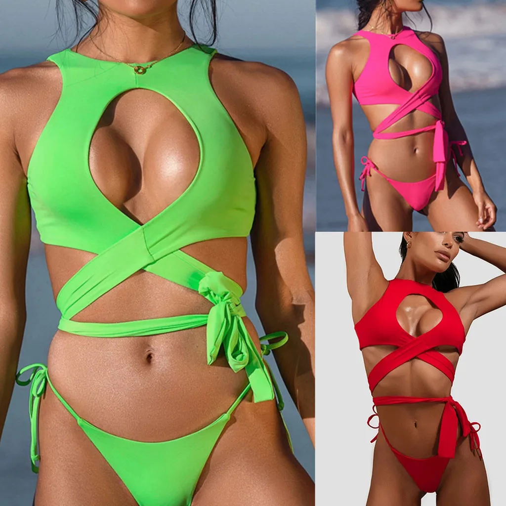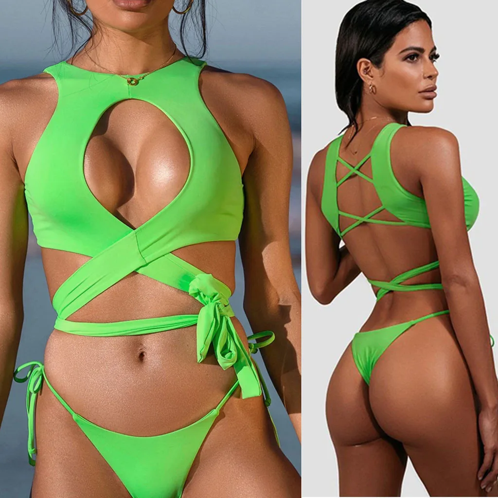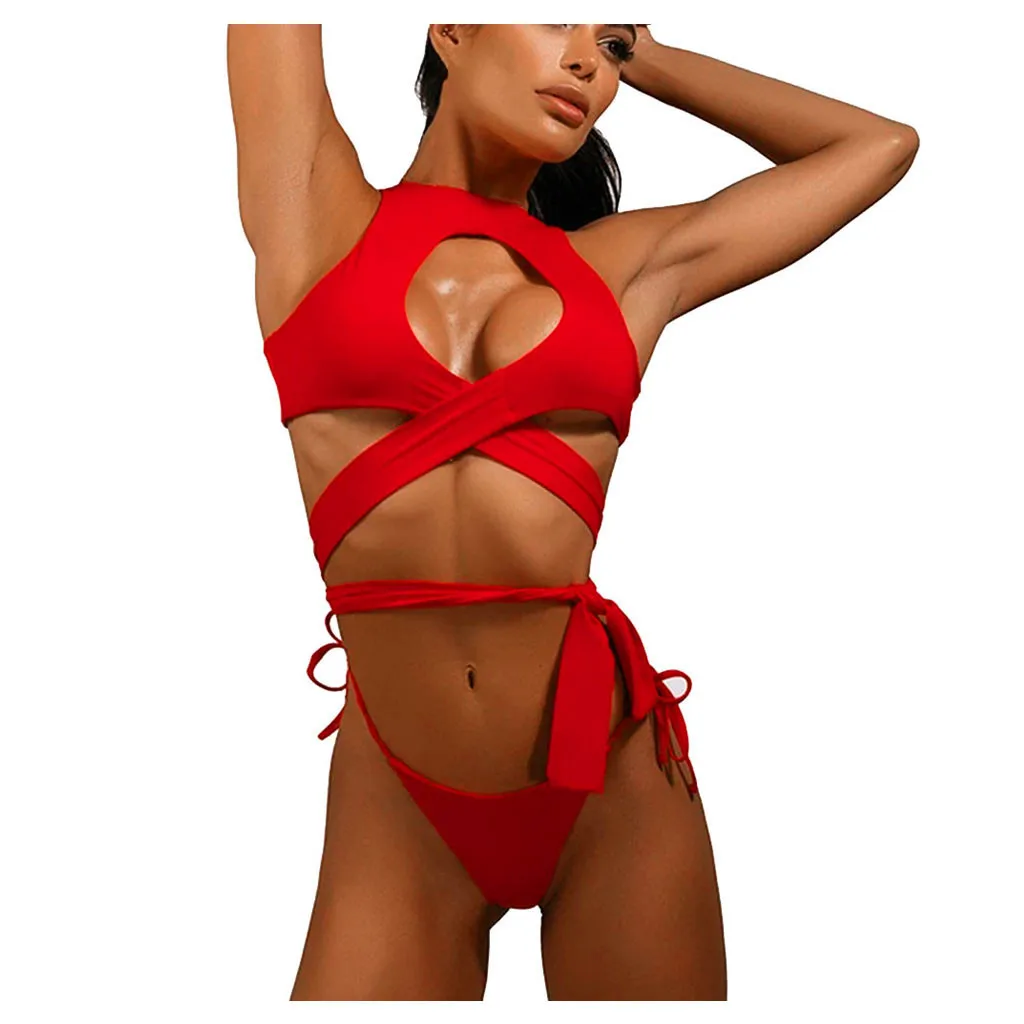 Womens Solid Bandage Criss Cross Push up Bikini Swimsuits Beach Bathing Suit